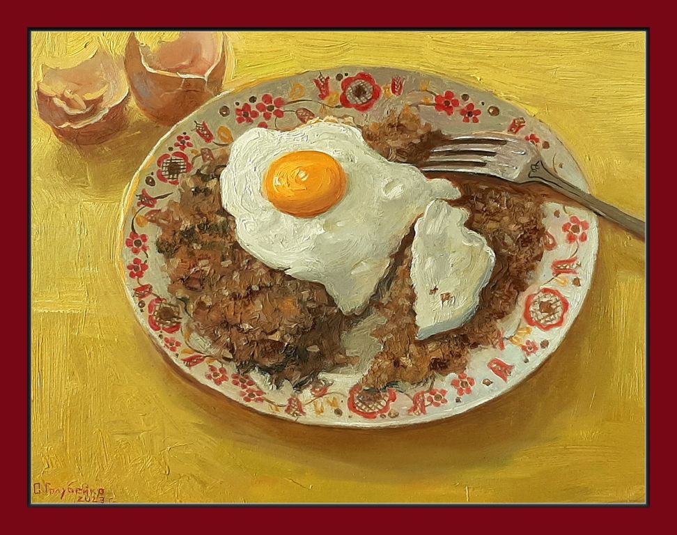 Натюрморт изображает простую композицию — декоративно исполненную тарелку с гречкой и яйцом.